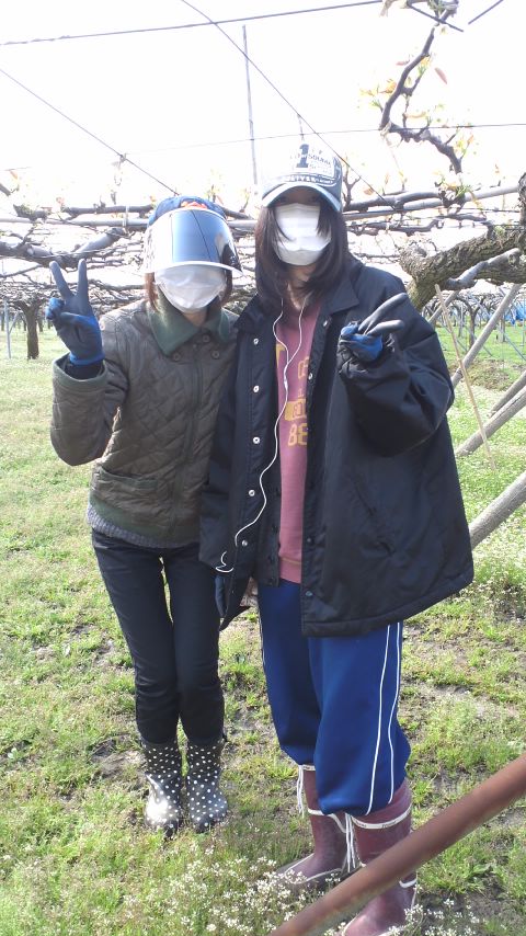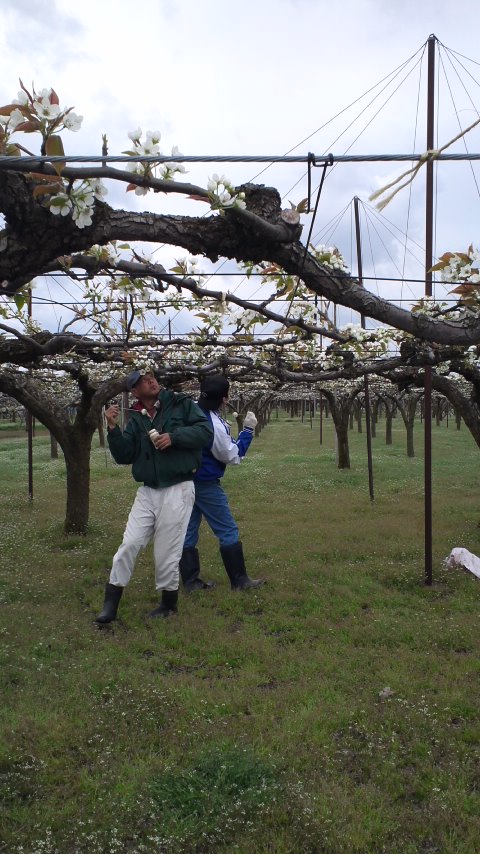 梨の花ひとつひとつ手で受粉していくので、なし畑はかなり背が低いです。